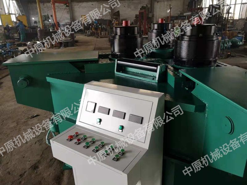 該機(jī)為叁輥型材卷圓機(jī),集機(jī)電一體。電機(jī)輸出的較高轉(zhuǎn)速通過(guò)傳動(dòng)裝置(聯(lián)軸器,液壓馬達(dá),液壓油缸,齒輪等)轉(zhuǎn)換成所需的大扭矩低轉(zhuǎn)速,帶動(dòng)兩主動(dòng)輥實(shí)現(xiàn)旋轉(zhuǎn)運(yùn)動(dòng),為型材行走提供扭矩。兩個(gè)主動(dòng)輥中心距可調(diào),被動(dòng)輥通過(guò)液壓油缸前進(jìn)、后退實(shí)現(xiàn)位移,來(lái)控制直徑大小。三個(gè)工作輥成等腰三角形分布,通過(guò)調(diào)整移動(dòng)輥實(shí)現(xiàn)這三個(gè)點(diǎn)形成的弧線達(dá)到所需彎曲半徑,借助被動(dòng)輥的壓緊及兩主動(dòng)輥的旋轉(zhuǎn)運(yùn)動(dòng),使型材經(jīng)過(guò)多次連續(xù)彎曲,產(chǎn)生永久性塑性變形,用于常溫狀態(tài)下將型材卷制成圓形,弧形等工件。